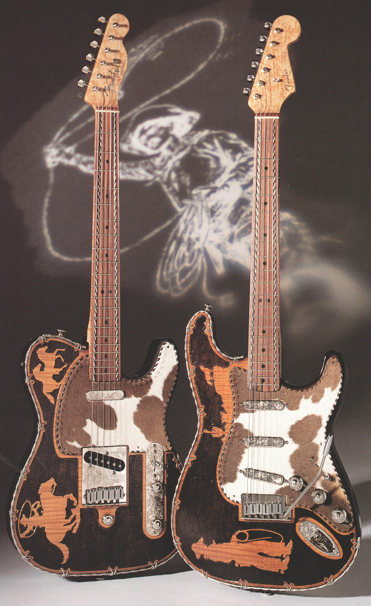 This Stratocaster and Telecaster set was designed and built by Alan Hamel, with carving by George Amicay, silver work by Alan Hamel and engraving by Miles Haworth. They have highly flamed maple tops with western silhouettes carved on solid alder bodies. They further have hand-twisted sterling silver barbed wire inlay, hair-on calfskin pickguards, hand-engraved hardware, bird's-eye maple maple necks with pau ferro fretboards and hand-twisted silver inlays.